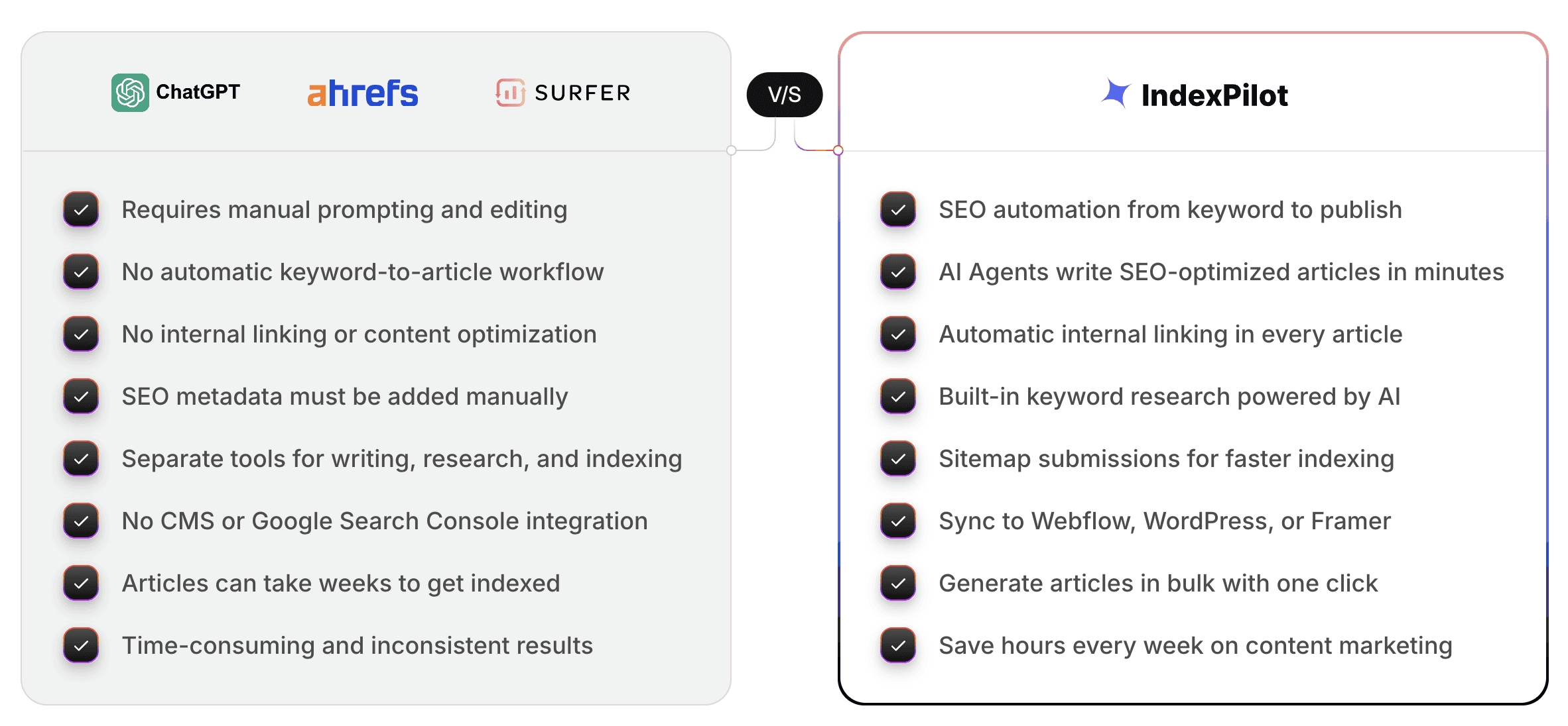 AI Agents create fully optimized articles with metadata and internal links, then syncs them to your CMS.